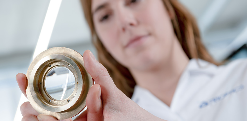The distance from the lens vertex to the upper contact surface can be manufactured with an accuracy of up to ±0.5 µm. Similarly, the diameter can be manufactured with an absolute accuracy of ±2 µm. The remaining centration error can be reduced to less than 0.5 µm by using a suitable alignment chuck. Moreover, a low coherent interferometer can be used to measure the center thickness on the machine, so that the contact surfaces can be manufactured with high precision with respect to each lens vertex. Multiple mounted lenses manufactured by alignment turning are then assembled to an objective lens. The method of machining in the micron range ensures that all lenses are aligned to each other. This allows mounted lenses to be assembled in a tube without further adjustment steps.